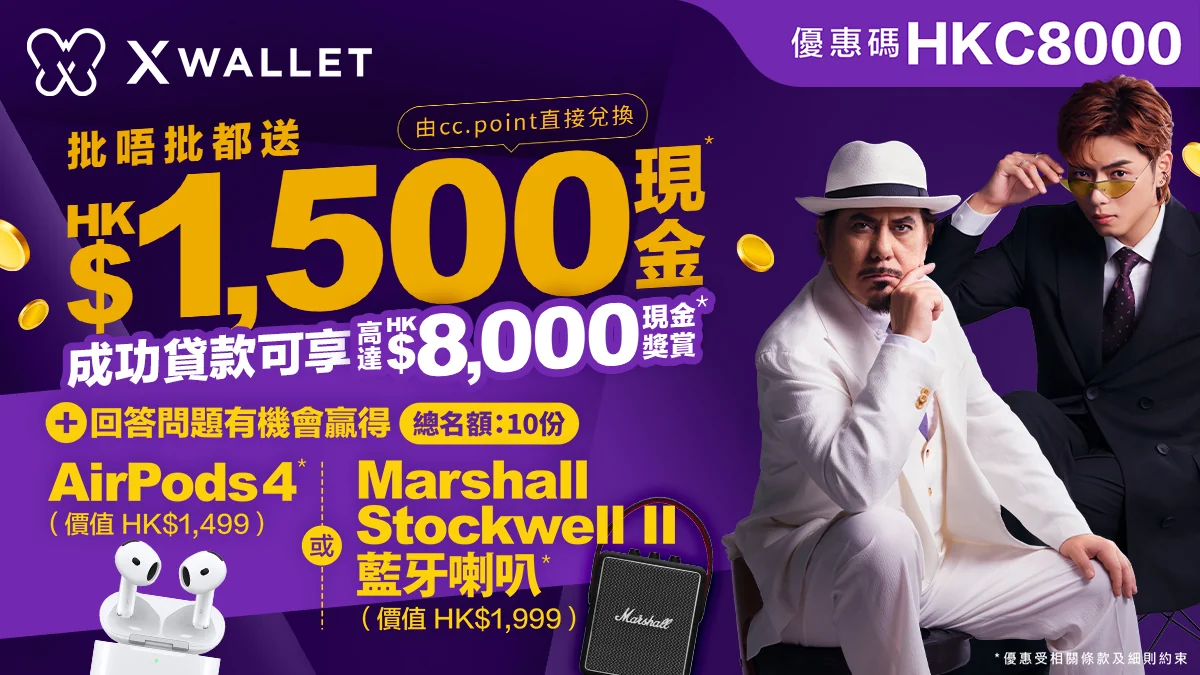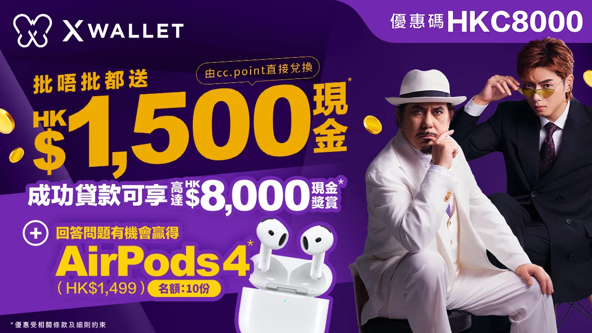 由2026年4月1日至4月30日期間,全新客戶在申請過程中輸入優惠碼「HKC8000」成功申請X現金A.I.貸款,批唔批都送HK$1,500現金*💰,成功貸款再送高達HK$8,000現金回贈*+回答指定問題有機會贏得AirPods 4*🎧