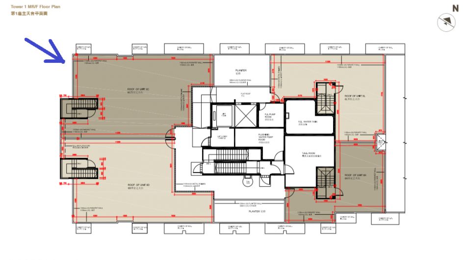 ▲1座6C單位與相連1,140呎天台(藍箭嘴所示)