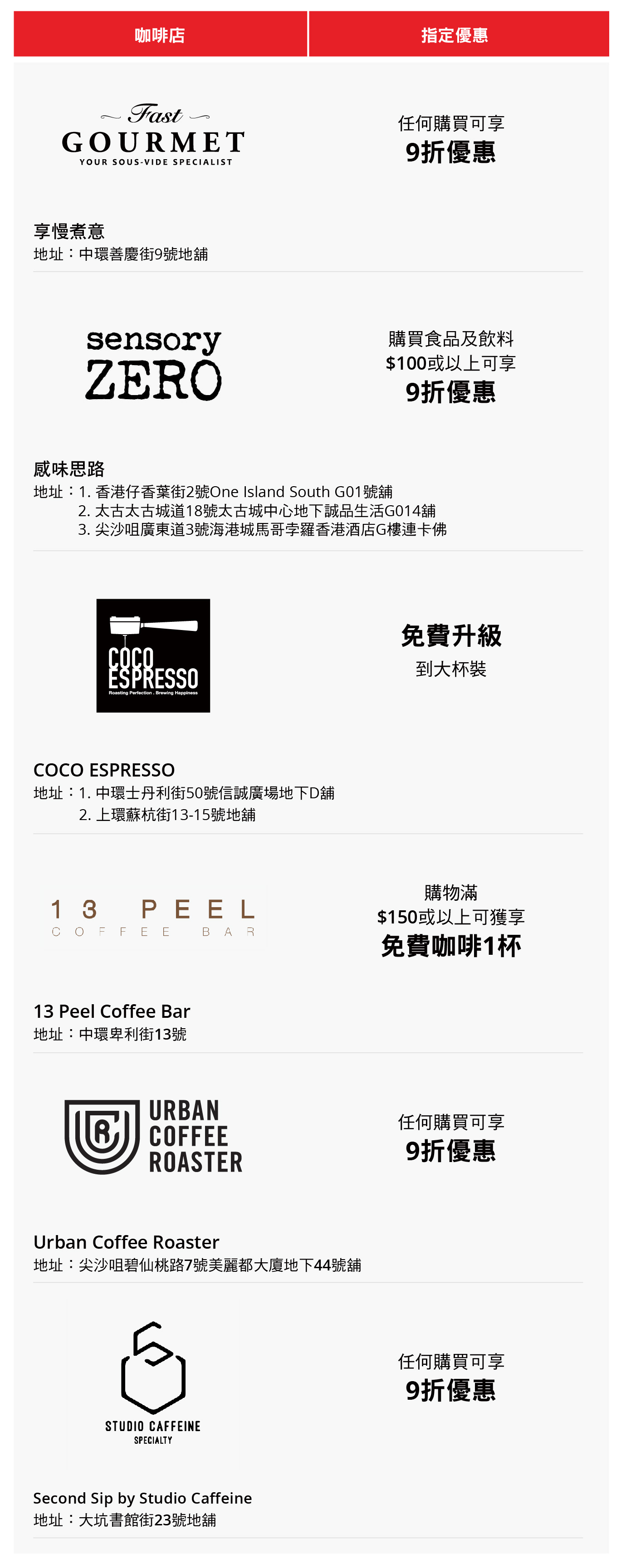 | COCO ESPRESSO | 中環、上環 | 免費升級到大杯裝 |