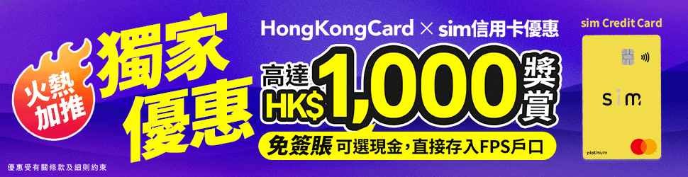 【限時優惠】由2026年2月1日至2月28日期間,全新客戶透過HongKongCard成功申請sim Credit Card,專享高達HK$2,269獎賞: