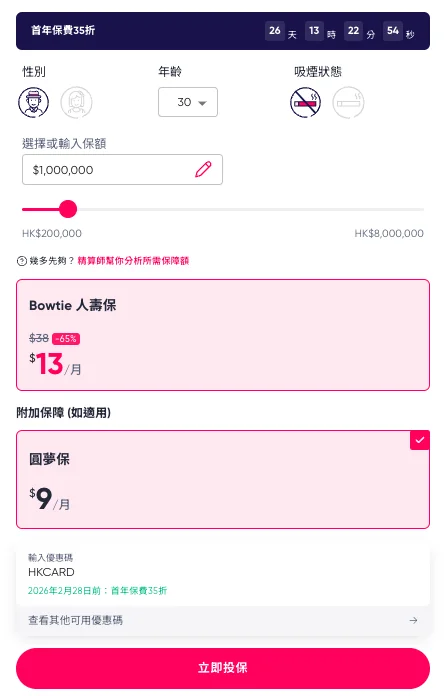 由2026年2月1日至2月28日期間,新客戶只要輸入優惠碼【HKCARD】投保Bowtie 人壽保,可享: