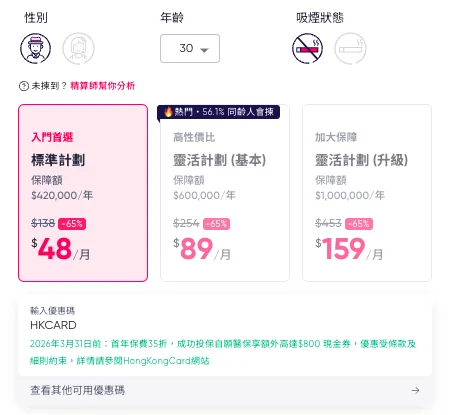 由2026年3月1日至3月31日期間,新客戶只要輸入優惠碼【HKCARD】投保Bowtie 保泰自願醫保 - 標準計劃,可享: