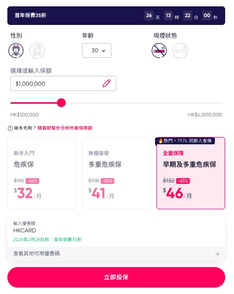 由2026年2月1日至2月28日期間,新客戶只要輸入優惠碼【HKCARD】投保Bowtie 危疾保,可享: