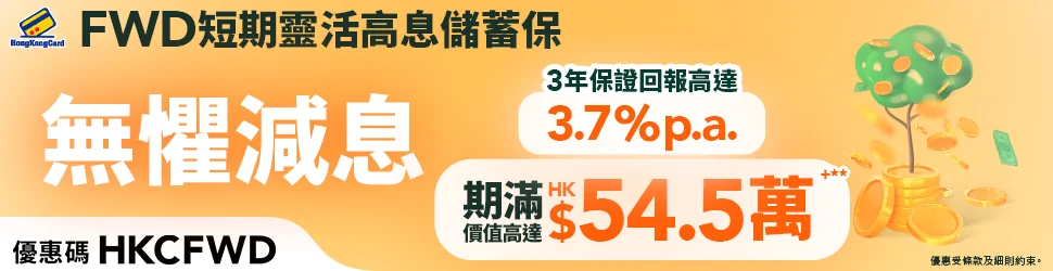 【限額發售¹】即日起至2026年1月31日,經FWD網上投保智快享儲蓄保險計劃,輸入優惠代碼「HKCFWD」,成功投保並以預繳選項方式繳交保費,即享: