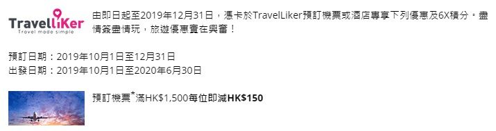 由即日起至2019年12月31日,憑卡於TravelLiker預訂機票或酒店專享下列優惠及6X積分。盡情簽盡情玩,旅遊優惠實在興奮,愛上外遊!