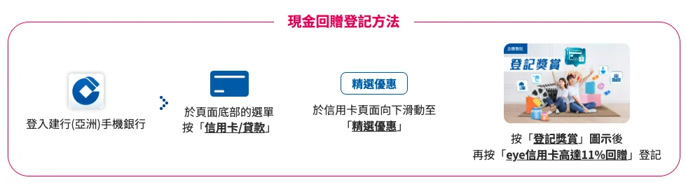由2026年1月1日至2026年3月31日,每月1號起經建行(亞洲)手機銀行登記「日日常常升級加碼賞3」,該月於本地餐飲、外賣平台及交通簽賬可享高達11%,可享現金回贈高達HK$1,200。