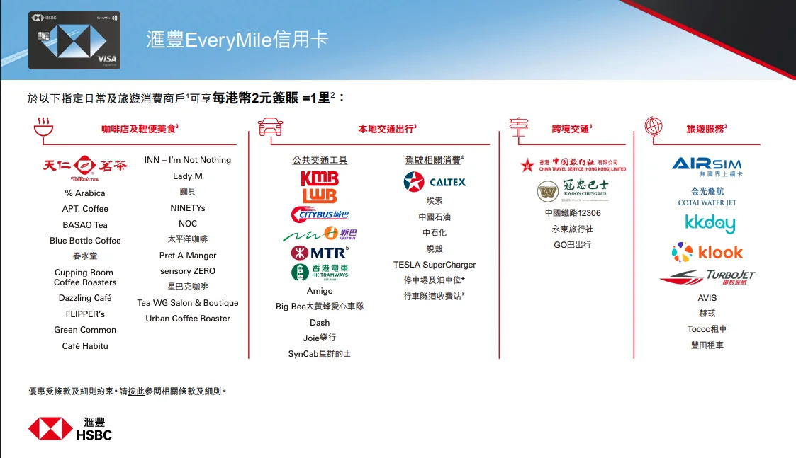 滙豐EveryMile信用卡於指定日常消費,包括特選本地交通出行、咖啡店及輕便美食及旅遊消費商戶可享HK$2/里,其他本地簽賬HK$5/里,更有一系列旅遊禮遇,包括免費享用香港及海外機場貴賓室或指定機場食肆之免費餐飲服務、免費旅遊保險等,喜歡旅遊朋友必定要有一張!